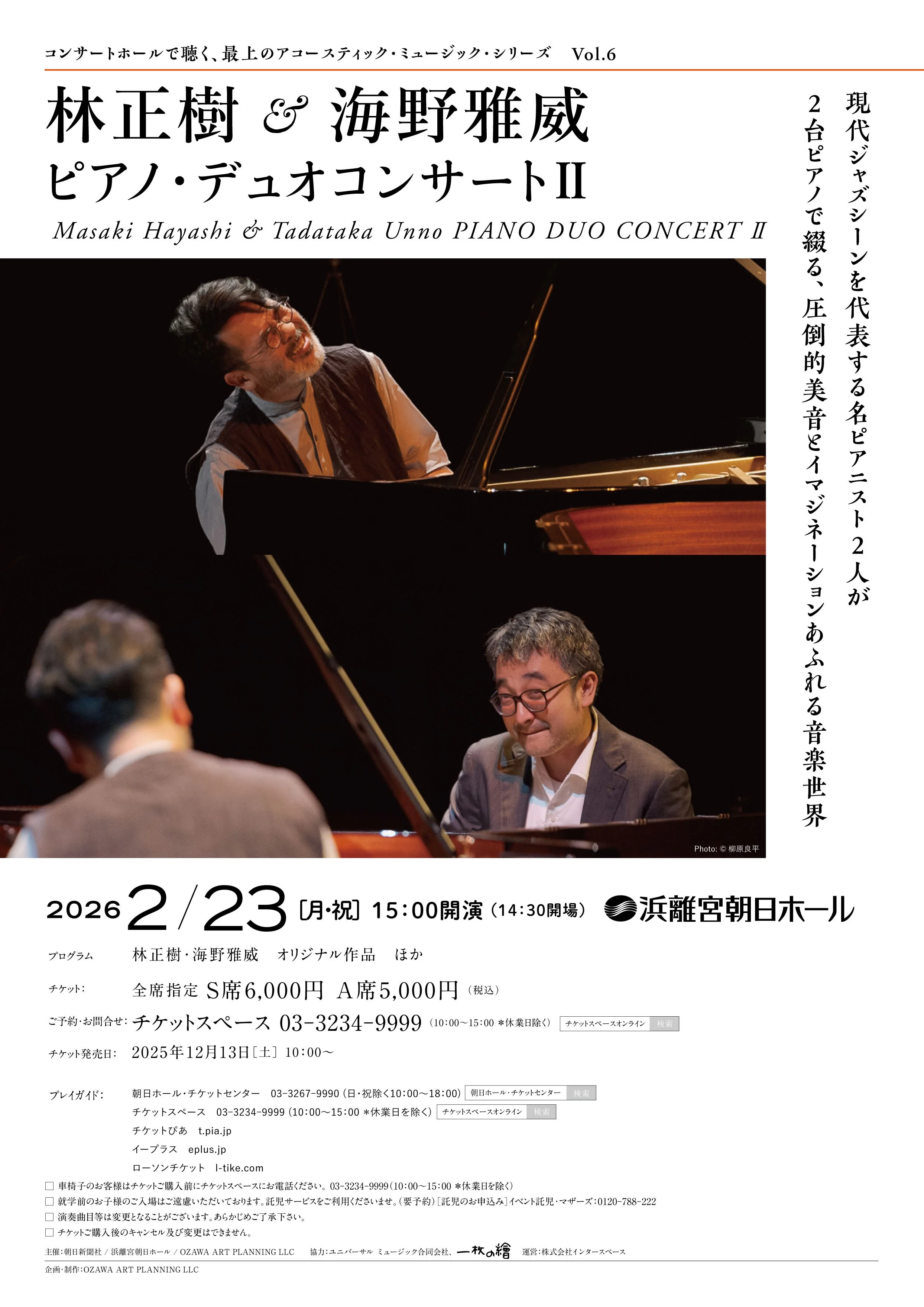 Hamarikyu Asahi Hall, Tokyo Monday, February 23, 2026 3:00 PM 5:30 PM 15:00 17:30 Google Calendar ICS Masaki Hayashi & Tadataka Unno Piano DuoMasaki Hayashi - pianoTadataka Unno - piano